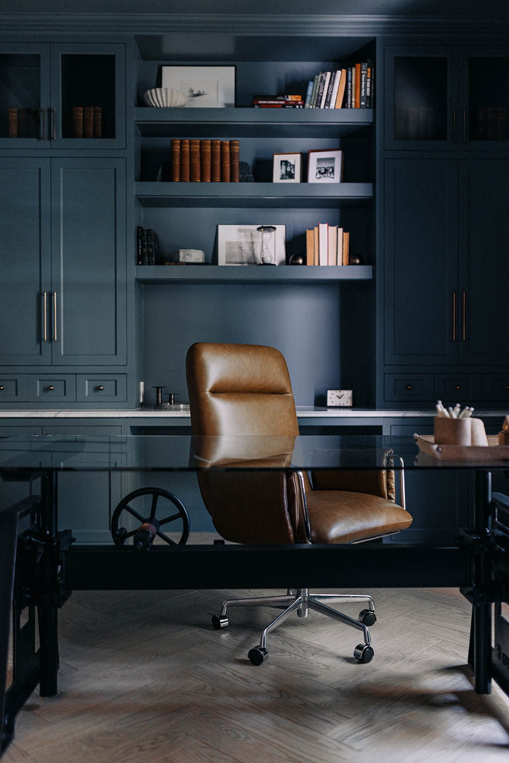 We also carved out spaces that reflect how this family lives. A moody, expanded office with custom cabinetry and personal touches. An upstairs media room that finally feels inviting and worth using. In the family room, we aligned ceiling heights, rebuilt the fireplace, and added tall built-ins and deeper seating to better support gathering.